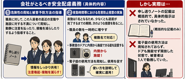 退居が完了していない時点では、会社は職員に対する関係で、安全配慮義務として、危険性に適切に対処し、生命身体に危害が及ぶことを防ぐ措置を採るべき義務を負っていた。