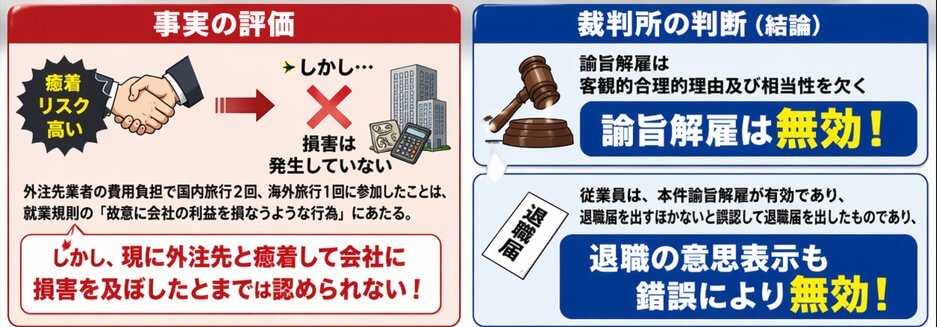 →外注先業者の費用負担で国内旅行2回、海外旅行1回に参加したことは、癒着が生じるリスクが高く、就業規則の「故意に会社の利益を損なうような行為」にあたる。しかし、現に外注先と癒着して会社に損害を及ぼしたとまでは認められないから、諭旨解雇は客観的合理的理由及び相当性を欠く。